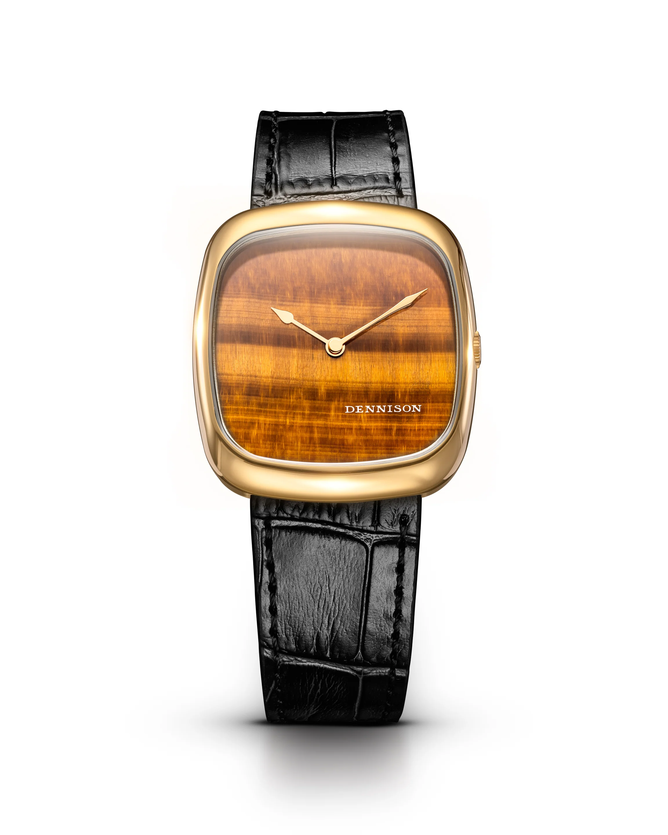 Embossed black leather strap with a bespoke pin-buckle that reflects the elegant curvature and finish of our ALD case.