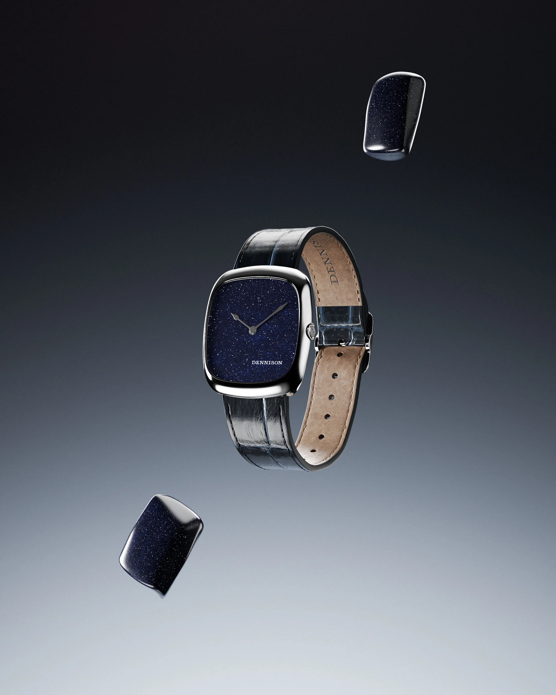 A distinguished revival of the classic Dennison cushion case, the ALD Collection channels the timeless refinement and flair of the 1960s. The dial features Midnight Aventurine, a stone steeped in darkness with shimmering inclusions. Each dial is carefully cut and polished, revealing a constellation of texture and depth. Available in stainless steel, the case measures 37mm by 33.5mm, and 6mm thickness. Complemented by an embossed blue leather strap with a bespoke pin-buckle that reflects the elegant curvature and finish of the case. A testament to enduring style and subtle detail. Additional colour straps can be added to your order.